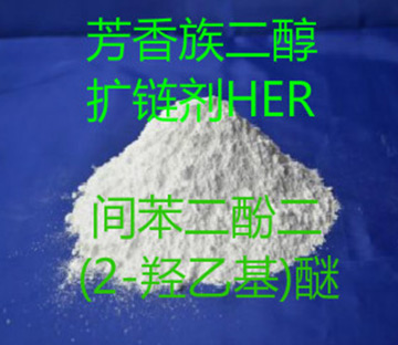 HER,間苯二酚二(2-羥乙基)醚是一種對稱的芳香族二醇擴鏈劑,它與MDI有著良好的配伍性。廣泛應(yīng)用于混煉型、澆注型、熱塑型的PU彈性體制品。這種材料已經(jīng)被證實能夠較大限度地維持彈性體的持久性、彈性和可塑性,并把收縮性限制到較小,沒有污染。同時,該材料除具有芳香族擴鏈的優(yōu)點外,還避免了HQEE在稍微降溫情況下迅速結(jié)晶現(xiàn)象的不足,提供了更好的可塑性、撕裂強度、初始強度、邵氏硬度、壓縮變形、斷裂變形以及低收縮性、抗切割、柔韌性好、防滲透性、熔點低